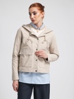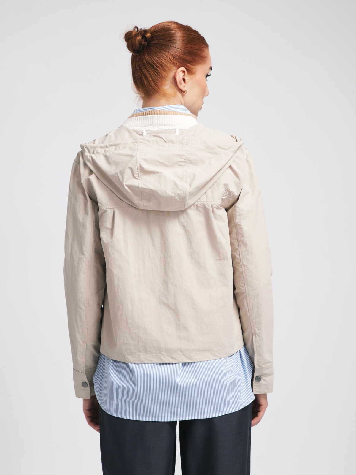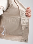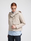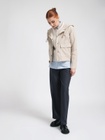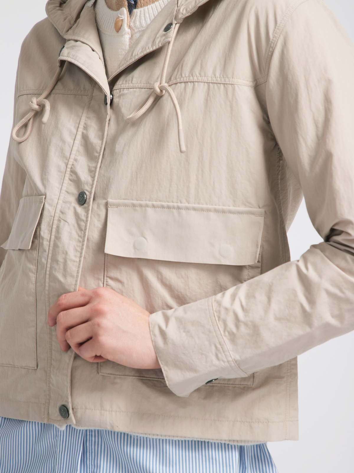 Капюшон прикреплен и регулируется толстым шнуром. Куртка застегивается спереди на пуговицы и имеет два кармана. Мягкая ткань изготовлена из 100% переработанного полиамида и хлопка. Ткань этой куртки отталкивает воду.